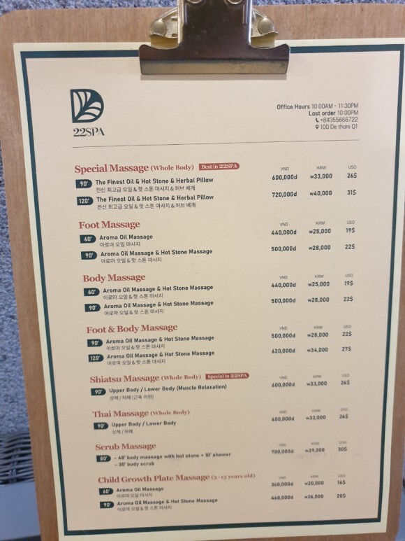 22spa는 120분 짜리가 720,000동(한화 40,400원)