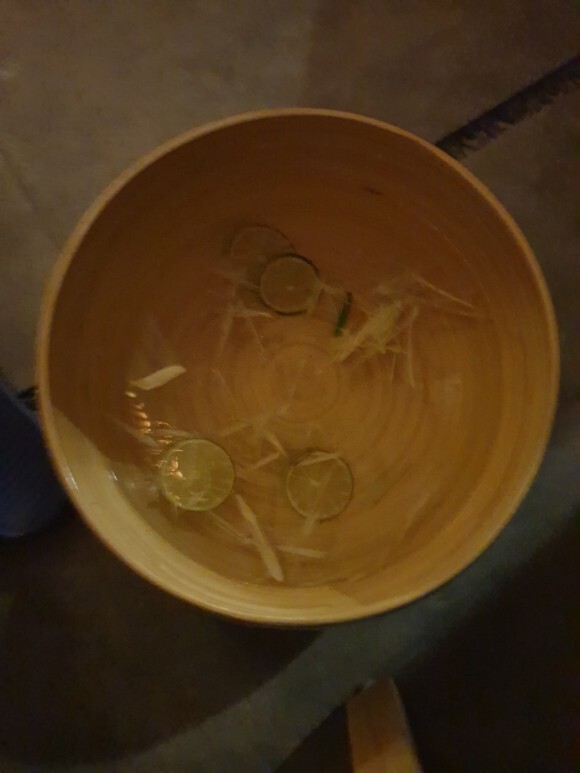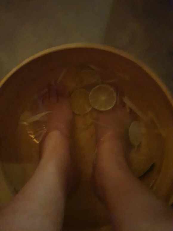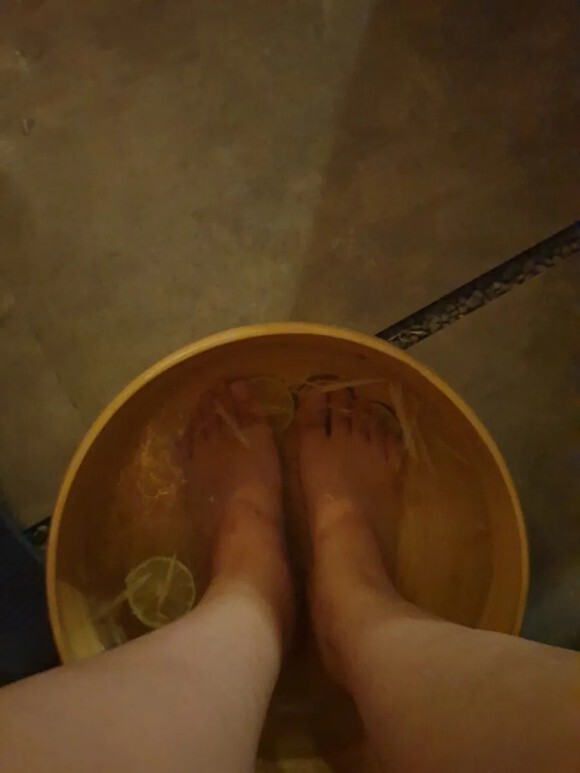하여튼 옷을 다 입고나면 라임과 생강이 든 물 바구니에 발을 담근다.